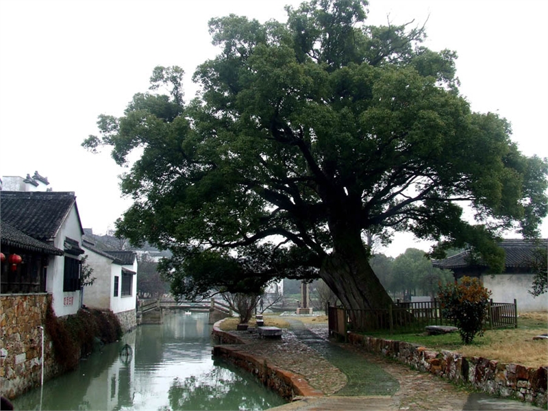古樟已经有近千年的历史了。壮年时它枝叶茂盛,荫覆近百亩,是船家休息、村人纳凉的好地方。如今树身北面已成枯木,只有靠南面的树皮维持着生命。看上去显得苍老、疲惫。据传,古樟遭受过一次意外的打击。