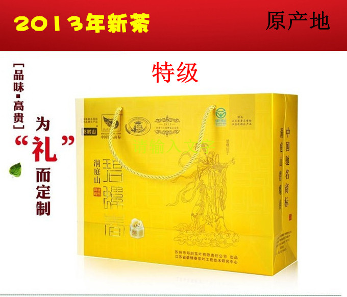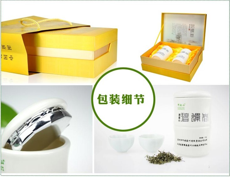 特级碧螺春礼盒包装采用原产地碧螺春包装盒黄色礼盒,又绿色环保标识,送人不仅体面,更让人放心。
