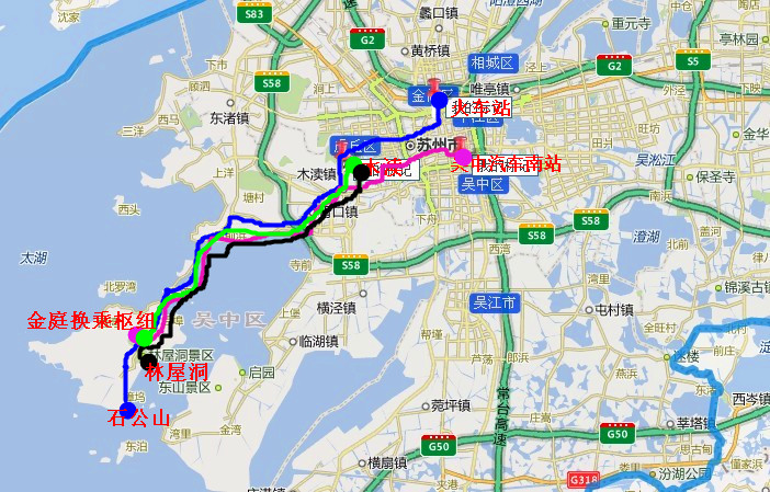 火车站往石公山方:新火车站北临时广场 - 钱万里桥北 - 清塘新村北 - 仁安街 - 金门路 - 古吴饭店(轨道交通桐泾北路站) - 彩香新村西(轨道交通桐泾北路站) - 彩虹新村 - 附二医院 - 新城花园酒店 - 锦华苑 - 飞利浦 - 百合花公寓 - 苏州乐园(轨道交通苏州乐园站) - 御花园(轨道交通苏州乐园站) - 新升新苑北 - 金色小学 - 木渎新区(轨道交通金枫路站) - 新华路(轨道交通木渎站) -中华园大酒店(轨道交通木渎站) - 天平大酒店 - 木渎天虹 - 木渎 - 木渎人民医院 - 木渎严家花园 - 方家桥 - 许家桥 - 胥江工业园 - 胥口镇政府 - 龙华服装厂 - 香榭 - 三洋 - 太湖度假区游客中心东 - 太湖度假区游客中心西 - 梅舍 - 水桥 - 郁舍 - 姚舍- 香山花园 - 蒋墩 - 墅里村 - 太湖明珠度假村 - 渔洋公园 - 长沙岛 - 宝岛花园 - 叶山岛 - 金庭游客导向中心 - 庭山村 - 金庭农业园区 - 申丰 - 余池 - 金庭镇政府 - 群立桥 - 古樟园 - 徐家场 - 梅园 - 包山寺 - 林屋洞 - 秉场 - 仇巷 - 夏家 - 樟坞 - 梧巷- 石公山首末站 (64站)